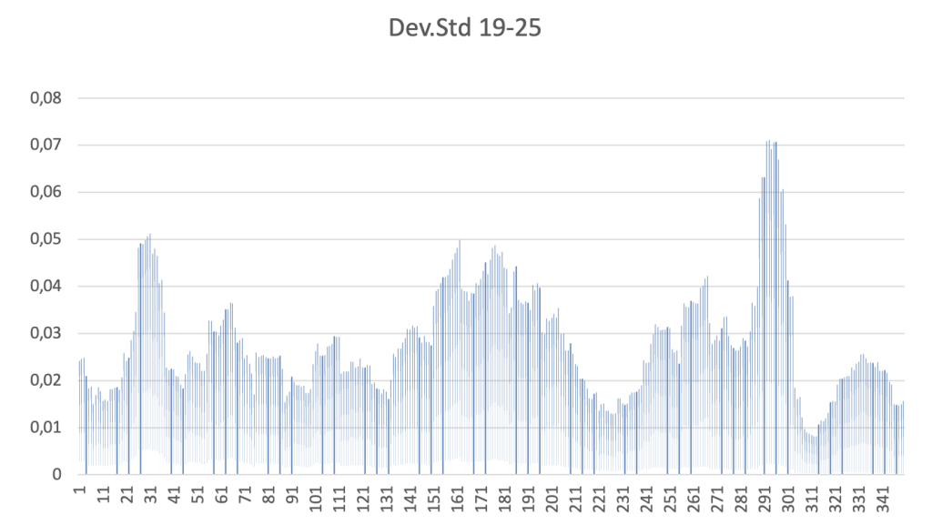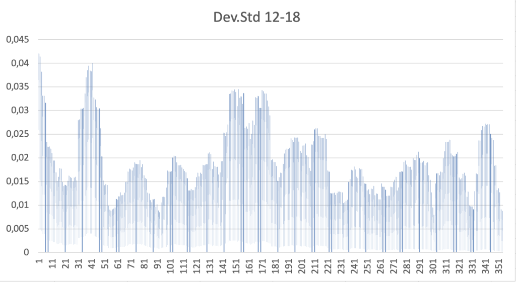 Come si può vedere da entrambi i grafici, sebbene la distribuzione della volatilità nei due periodi sia ovviamente diversa, si notano chiaramente dei picchi, e la media della volatilità (in pratica l’altezza media delle barre verticali) risulta simile.