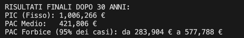Questo perché nel PAC non investi 100.000€ il primo giorno, ma li distribuisci nel tempo. Nonostante quindi l’indice faccia un certo rendimento, nella nostra simulazione chi fa un PAC investendo un totale di 100.000€ si ritroverà con una cifra molto diversa (spesso tra 300.000€ e 600.000€) perché il capitale investito negli ultimi anni non ha avuto 30 anni di tempo per crescere con l’interesse composto.