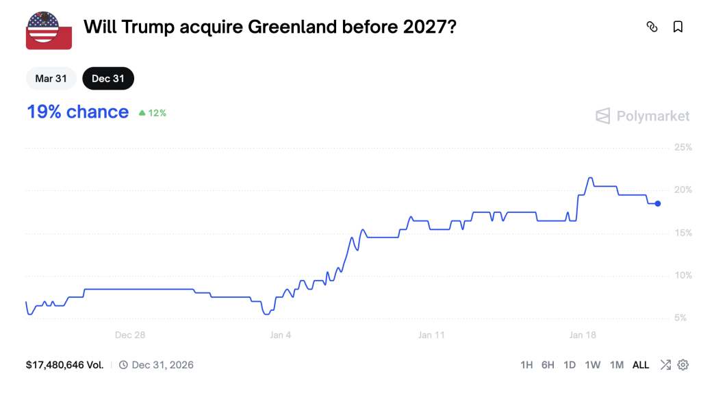 Per dare un’idea del sentiment della “massa” sulla questione, qui sotto è riportato un grafico di una nota piattaforma di scommesse su eventi, che mostra l’opzione “Trump acquisirà la Groenlandia prima del 2027?” con una probabilità del 19%. Questa stima è calcolata su un volume totale di scommesse pari a 17.5 milioni di dollari: