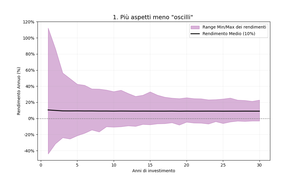 In altre parole, più lungo è l’orizzonte di investimento, maggiore è la probabilità statistica di ottenere un risultato positivo e più i rendimenti tendono ad avvicinarsi al valore medio atteso.