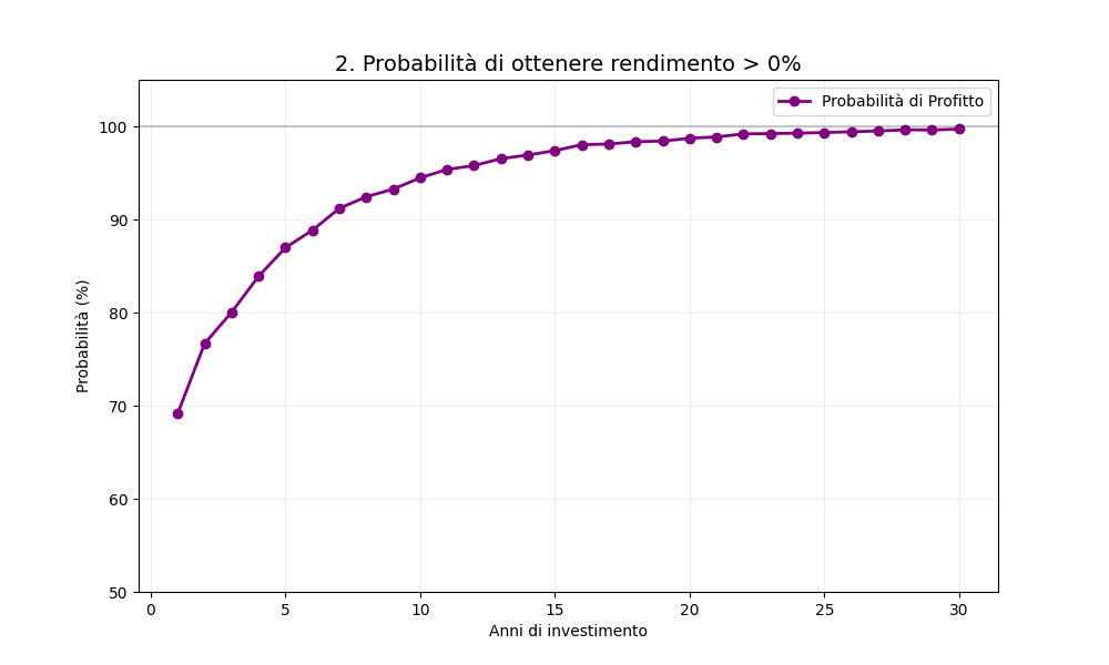 E soprattutto, come mostriamo nel grafico seguente, ciò che cambia in modo significativo è la probabilità di successo, cioè la probabilità di ottenere un rendimento positivo al variare dell’orizzonte temporale.