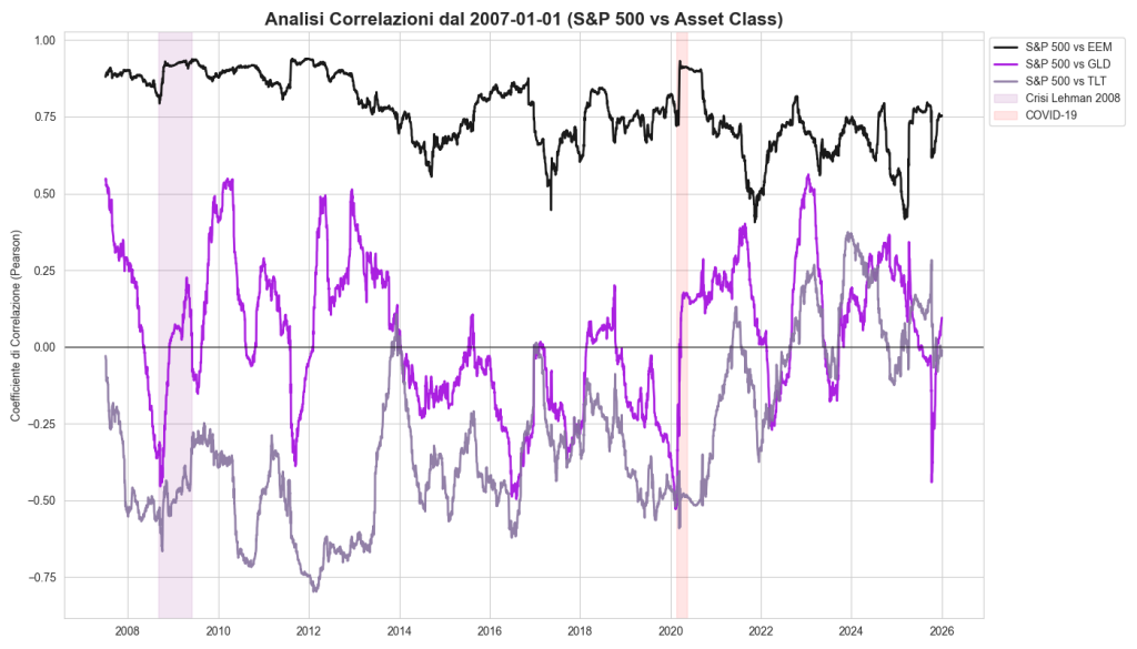 Come potete vedere, durante le due crisi evidenziate dalle fasce verticali, quella del 2008 e quella legata al Covid, la correlazione tra le diverse coppie di asset tendeva ad aumentare. Un esempio significativo è l’oro, che in quelle fasi è passato da una correlazione negativa a una correlazione positiva con il mercato azionario americano.