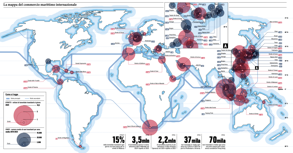 Tuttavia, come dicevamo, viviamo in un mondo globalizzato ed esposto a eventi negativi che possono coinvolgere contemporaneamente tutte le economie, a differenza di quanto accadeva in sistemi più frammentati come quello delle poleis greche. Per questo motivo vi lasciamo alcune infografiche che permettono di avere un quadro più dettagliato degli approvvigionamenti globali, delle principali rotte commerciali, dei porti e degli stretti strategici coinvolti.