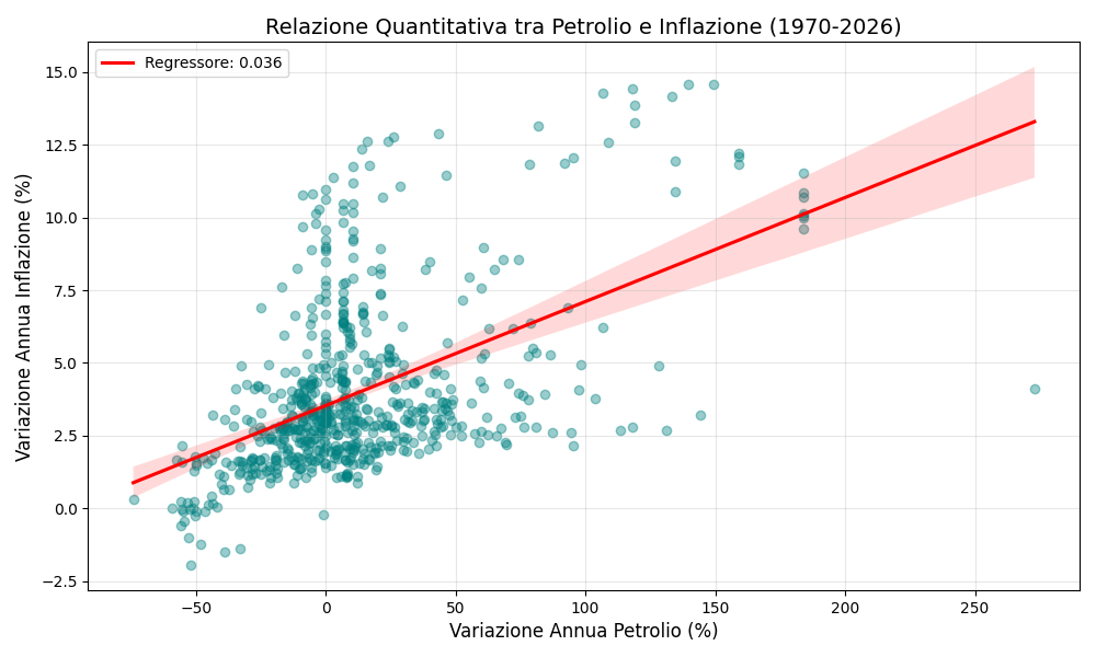 L’analisi permette di identificare la sensibilità del costo della vita rispetto alle oscillazioni del mercato energetico. I dati raccolti dimostrano che il legame tra queste due variabili non è frutto del caso, ma una relazione solida e costante nel tempo. Nello specifico, il valore del coefficiente calcolato indica che ogni volta che il prezzo del petrolio cresce del 10%, l’inflazione subisce una spinta al rialzo di circa lo 0.36%. Sebbene possa sembrare una cifra contenuta, questo dato rappresenta la capacità dell’energia di agire come un moltiplicatore di costo che si scarica inevitabilmente sui prezzi finali dei beni e dei servizi.