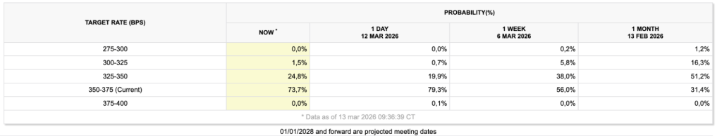 Solo un mese fa le probabilità cumulate di un ribasso dei tassi erano intorno al 70%. Oggi, invece, con una probabilità di circa il 70% il mercato si aspetta che il 17 giugno i tassi rimangano nella forchetta 350-375, che è quella attuale.