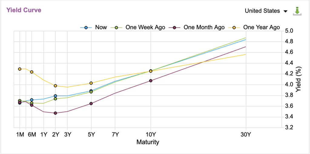 Partendo dal mercato obbligazionario, possiamo osservare nel grafico seguente come la curva dei Treasury mostri un chiaro segnale di irripidimento rispetto al passato: