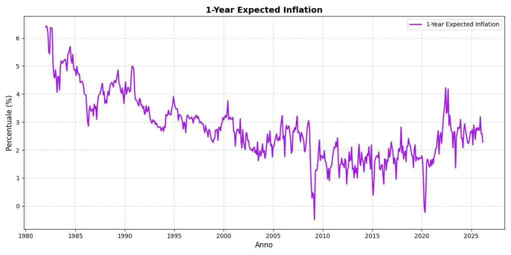 Fin qui il quadro appare coerente. Tuttavia, se si osservano le aspettative di inflazione a 1 anno, emerge un elemento di discontinuità: