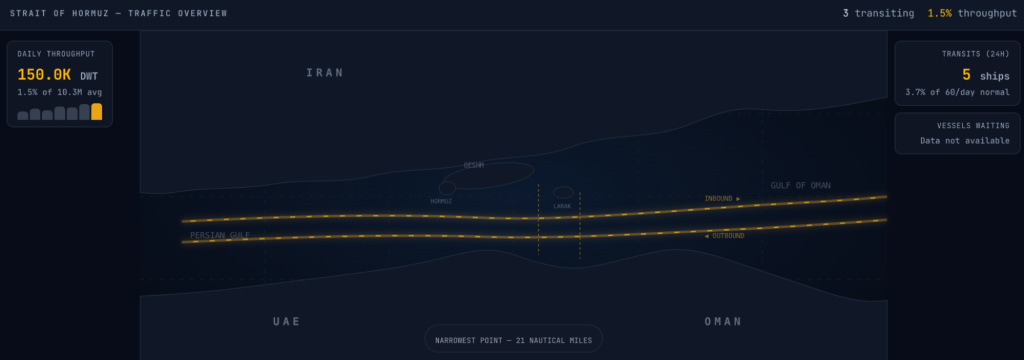 Il cessate il fuoco è un accordo politico. Lo Stretto è ancora fermo. Come si può vedere da questo grafico che mostra il transito di navi oggi nello stretto: