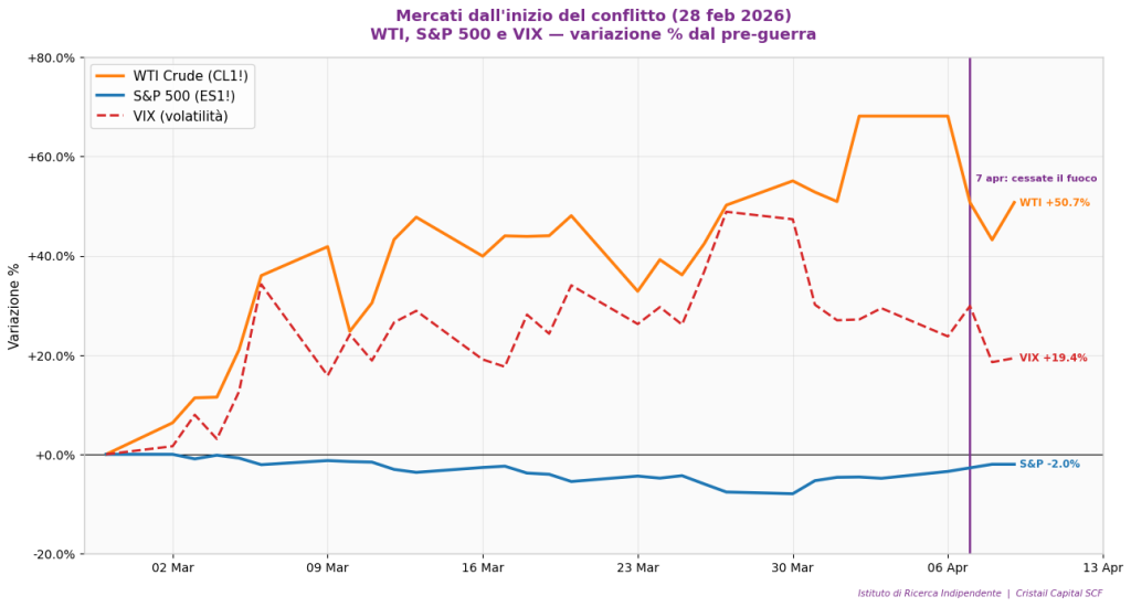 L’azionario è quasi tornato ai livelli pre-guerra, manca meno dell’1%. Il petrolio è ancora su del 50%. La volatilità non è rientrata al punto da cui era partita. Tre indicatori che in condizioni normali si muovono in modo coerente, oggi raccontano storie diverse.